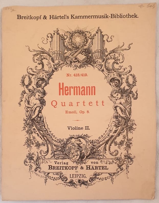 Edizione di fine ottocento di questo "Quartett" quartetto in bemolle tratto dall'opera 8 di Fried Hermann. Siamo in possesso della partitura per violoncello, viola e secondo violino. In ottime condizioni. Brossura editoriale in ottime condizioni generali con lievi usure ai margini e dorso. Legatura in ottime condizioni. All'interno le pagine si presentano in ottime condizioni con rare fioriture. In folio. Dim. 33,5x26,5 cm. Pp. 8, 10, 10. Ediiton of late XX century of "Quartett" emoll from the work 8 by Fried Hermann. We only have the musical score for violoncello, viola and second violin. In very good conditions. Editorial cover in very good general conditions slightly worn with tears in the edges and spine. Binding in very good conditions. Inside pages are in very good conditions with occasional foxings. Worn edges. In folio. Dim. 33,5x26,5 cm. Pp. 8, 10, 10.