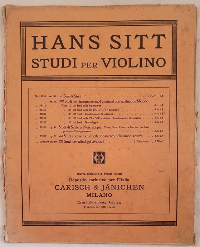 Edizione del 1910 di questi studi per viuolino di Hans Sitt. Siamo in possesso della seconda parte contenente 20 studi dall'opera 32. In mediocri condizioni. Brossura editoriale in discrete condizioni generali con lievi usure e strappi ai margini e dorso. Legatura in mediocri condizioni con rotture. All'interno le pagine si presentano in discrete condizioni con fioriture. Strappi marginali. In folio. Dim. 34x28 cm. Pp. 19.Ediiton of 1910 of these studies for violin by Hans Sitt. We only have the second part containing 20 studies form the work 32. In poor conditions. Editorial cover in fair general conditions slightly worn with tears in the edges and spine. Binding in poor conditions with cracks. Inside pages are in fair conditions with foxings. Worn edges. In folio. Dim. 34x28 cm. Pp. 19.