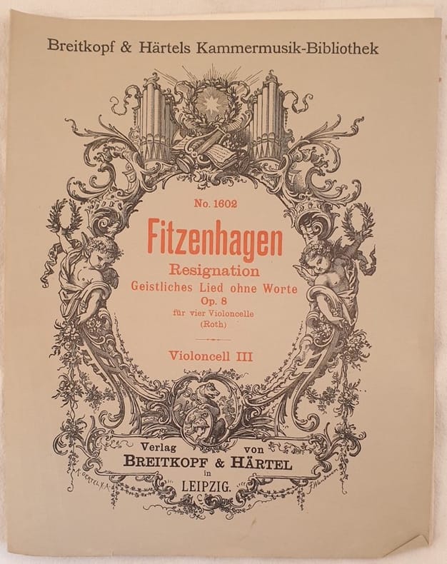 Edizione di fine ottocento della melodia "Geistliches Lied" tratta dall'opera 8 di Fitzenhagen. Siamo in possesso della partitura per terzo violoncello solamente. In ottime condizioni. Brossura editoriale in ottime condizioni generali con lievi usure ai margini e dorso. Legatura in ottime condizioni. All'interno le pagine si presentano in ottime condizioni con rare fioriture. In folio. Dim. 33,5x26,5 cm. Pp. 3. Ediiton of late 19th century of the melody "Geistliches Lied" from the work 8 by Fitzenhagen. We only have the part for third violoncello only. In very good conditions. Editorial cover in very good general conditions slightly worn with tears in the edges and spine. Binding in very good conditions. Inside pages are in very good conditions with occasional foxings. In folio. Dim. 33,5x26,5 cm. Pp. 3.<BR><BR>