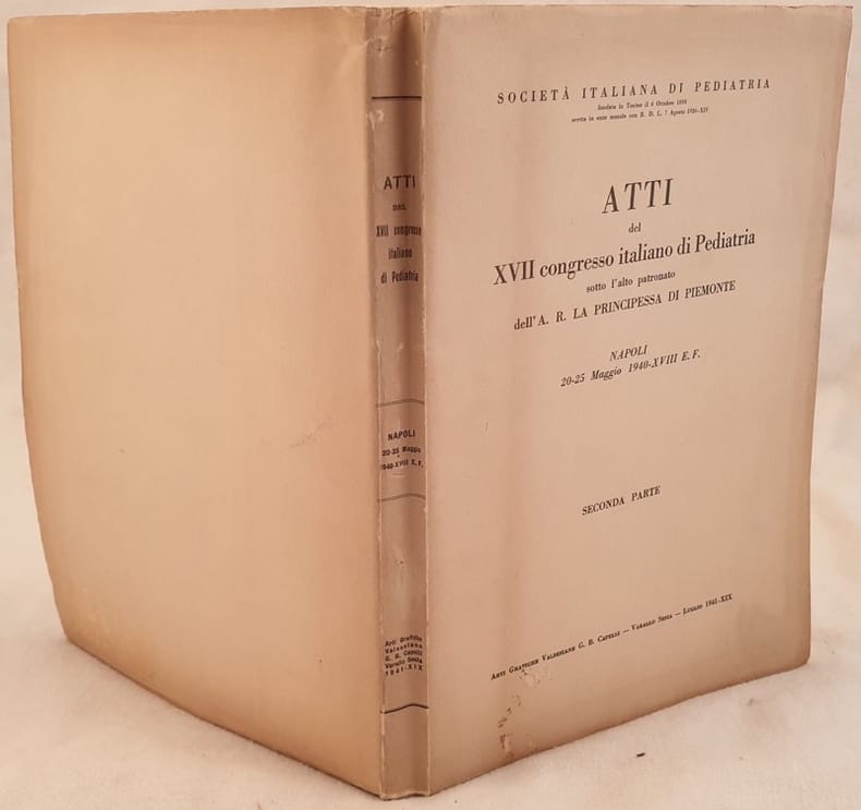 Raccolta di atti del XVII del congresso pediatrico italiano tenutosi a Firenze dal 20 al 25 maggio 1941. Gli argomenti: l'allevamento dell'immaturo, sindromi eritoblastiche nell'infanzia, la terapia delle meningiti purulente ecc... Numerose memorie su questi argomenti di vari autori: Macciotta, Racugno, Saputo, Squarcetta, Pagani, Ferraro, Pranzi, Cislaghi, Marotta, Piccioli, Leonee, Fornara, Vecchio, Calvino, Careddu, Trambusti, Vallisneri, ortolani, Schiavini, Sforza, Rossi, Murano, Ernandez, Frola, Piccioli, Fiordelisi ecc... In ottime condizioni. Copertina editoriale in ottime condizioni generali con lievi usure ai margini e dorso. Legatura in buone condizioni ma le prime VII pagine staccate. All'interno le pagine si presentano in ottime condizioni con rare fioriture. In 8. Dim. 25,5x18 cm. Pp. (VII)+da 333 a 683. Collection of acts of XVII pediatric congress held in Florence from 20th to 25th of may 1941. The issues: breeding of immature newborns, therapy of meningitis ecc... Differemt memories about these issues of different authors: Macciotta, Racugno, Saputo, Squarcetta, Pagani, Ferraro, Pranzi, Cislaghi, Marotta, Piccioli, Leonee, Fornara, Vecchio, Calvino, Careddu, Trambusti, Vallisneri, ortolani, Schiavini, Sforza, Rossi, Murano, Ernandez, Frola, Piccioli, Fiordelisi ecc... In very good conditions. Editorial cover in very good general conditions slightly worn in the edges and spine. Binding in good conditions but the first VII pages detached. Inside pages are in very good conditions with occasional foxings. In 8. Dim. 25,5x18 cm. Pp. (VII)+from 333 to 683.