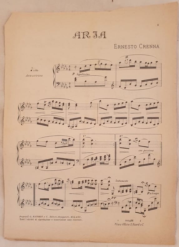 Bello spartito per pianoforte della fine dell'ottocento inizi novecento della melodia "Aria" di Ernesto Crenna. In buone condizioni. Copertina assente. Legatura editorialmente assente. Pagine in buone condizioni con qualche strappo. In folio. Formato cm. 32,5x24. Pp. 2. Beautiful musical score of late 19th pr early 20th century of the melody "Aria" by Ernesto Crenna. In good conditions. Cover is missing. Binding is almost missing. Pages in good conditions with some tears. In folio. Formato cm. 32,5x24. Pp. 2.<BR><BR>