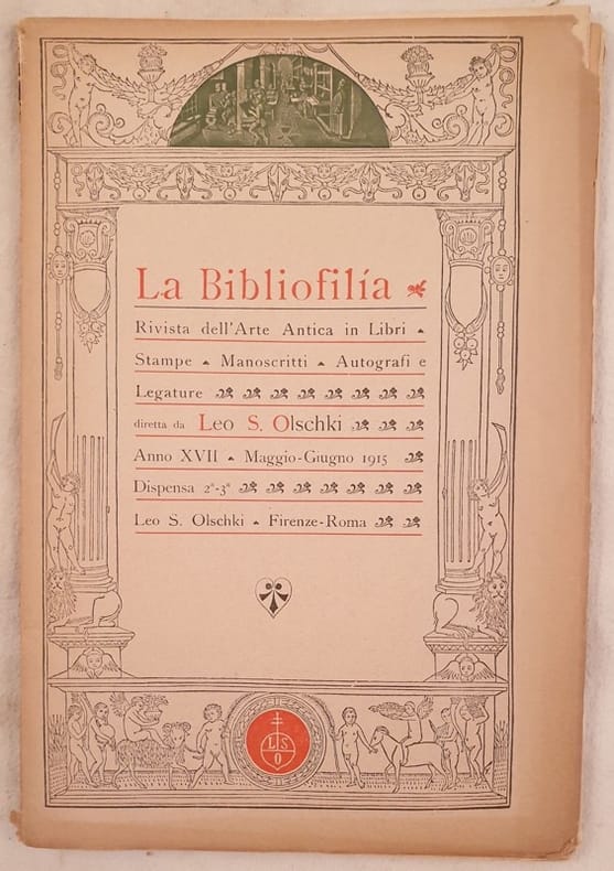 Numero del maggio giugno 1915 della rivista "La Bibliofilia" rivista dell'arte antica fondata nel 1899 da Leo Olschki. Tra gli articoli presenti: Lo Zibaldone boccaccesco della Medicina Laurenziana, Incunaboli di origine italiana nella Biblioteca dell'Accademia Ungherese delle scienze a Budapest, I disegni della galleria degli Uffizi, Gli incunaboli della Biblioteca Comunale di Piacenza, Les Romans de chevalerie italiens d'inspiration espagnole, Corriere d'Ungheria, Bibliografia dell'aria ecc... Planches e alcune illustrazioni. In buone condizioni. Copertina editoriale in buone condizioni con usure e parti mancanti ai margini e dorso. Legatura in discrete condizioni con rotture. All'interno le pagine si presentano in ottime condizioni con rare fioriture. In 4. Dim. 30x20,5 cm. Pp. da 45 a 124.Number of may june 1915 of the magazine "La Bibliofilia" magazine of ancient art established in 1899 by Leo Olschki. Between the articles inside: Zibaldone Boccaccio of Medicina Laurenziana, Incunables of italian origin in Biblioteca dell'Accademia Ungherese delle scienze in Budapest, drawings of gallery in Uffizi, Incunables of comunal library in Piacenza, Les Romans de chevalerie italiens d'inspiration espagnole, Corriere d'Ungheria, Bibliography of the air ecc... Planches and some illustrations. In good conditions. Editorial cover in good conditons with wearings and missing parts in the edges and spine. Binding in fair conditions with cracks. Inside pages are in very good conditions with occasional foxings. In 4. Dim. 30x20,5 cm. Pp. from 45 to 124.