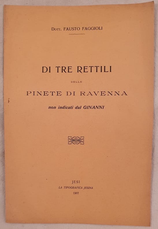 Interessante studio di Fausto Faggioli su tre rettili nelle pinete di Ravenna secondo quanto enunciato da Francesco Ginanni nella sua opera " Istoria civile e naturale delle pinete Ravennati " pubblicata nel 1774. Estratto dalla Romagna anno IV fasc. XII. Lo studioso in questo estratto descrive queste tre specie. Copertina editoriale in ottime condizioni generali. Legatura i buone condizioni. Pagine in ottime condizioni con rare fioriture. In 8. Dim. 24x17 cm. Pp. 22. Interesting study by Fausto Faggioli about three reptiles in the pinewood of Ravenna according to Francesco Ginanni in his work " Istoria civile e naturale delle pinete Ravennati " published in 1774 Extract from Romagna year IV fasc. XII. Editorial cover in very good general conditions.Binding in good conditions. Pages in very good conditions with occasional foxings. In 8. Dim. 24x17 cm. Pp. 22.