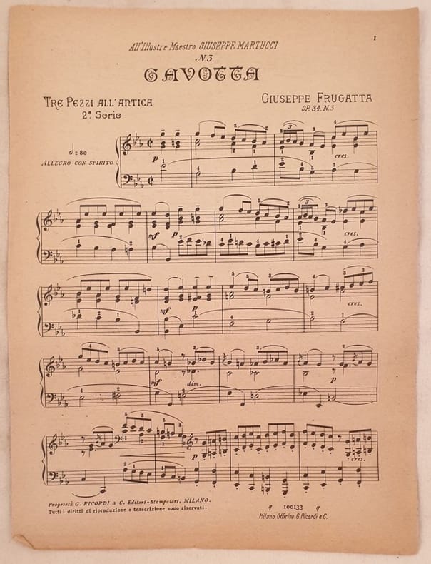 Edizione Ricordi di questo spartito per pianoforte del pezzo "n. 3 Gavotta" per pianoforte del compositore originario di Bergamo Giuseppe Frugatta (1860-1933). Senza data ma di inizio novecento. Buone condizioni. In 4. cm 32x24. pp. (4). Ricordi edition of this musical score for piano "n. 3 Gavotta" by the composer from Bergamo Giuseppe Frugatta (1860-1933).. Not dated but of early 20th. Good conditions. In 4. cm 32x24. pp. (4).