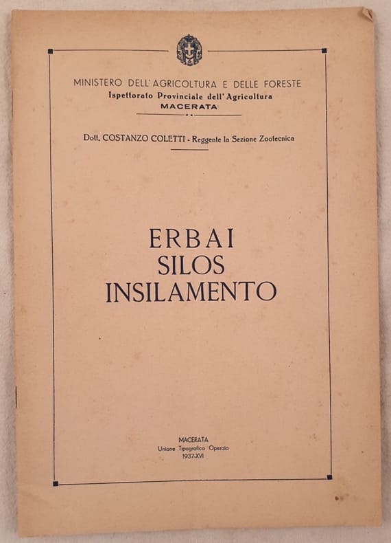 Interessante monografia del 1937 sugli erbai silos e insilamento scritto da Costanzo Coletti edito dal Ministero dell'agricoltura e delle foreste.<BR><BR>Numerose fotografie d'epoca all'interno tra cui un gruppo di contadini a Civitanova.<BR><BR>In buone condizioni.<BR><BR>Copertina editoriale in buone condizioni generali con lievi usure ai margini e dorso. Legatura in buone condizioni. All'interno le pagine si presentano in buone condizioni con rare fioriture. Piegatura verticale. In 8. Dim. 24,5x17 cm. Pp. 27.