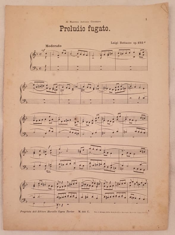 Bello spartito per pianoforte della fine dell'ottocento inizi novecento della melodia "Preludio fugato" dall'op. 132a di Luigi Bottazzo. In buone condizioni. Copertina assente. Legatura editorialmente assente. Pagine in buone condizioni con qualche strappo. In 4. Formato cm. 29x21. Pp. 3. Beautiful musical score of late 19th pr early 20th century of the melody "Preludio fugato" from work 132a by Luigi Bottazzo. In good conditions. Cover is missing. Binding is almost missing. Pages in good conditions with some tears. In 4. Formato cm. 29x21. Pp. 3.