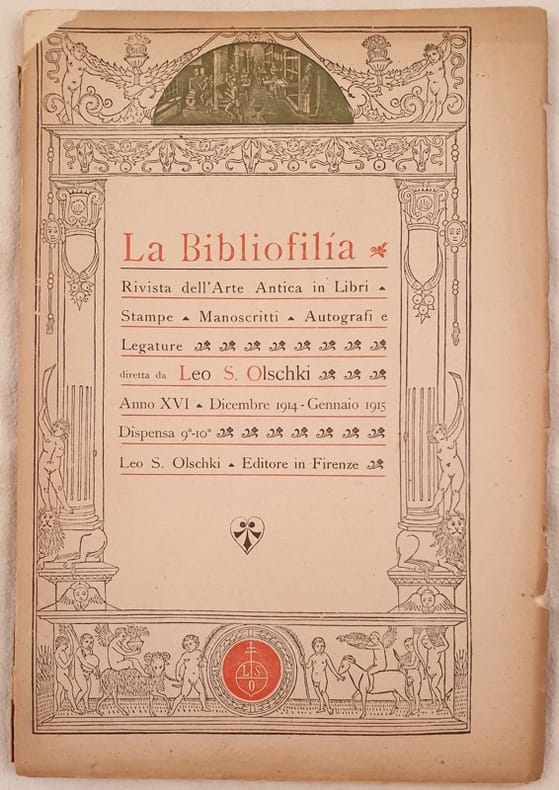 Numero del dicembre 1914 gennaio 1915 della rivista "La Bibliofilia" rivista dell'arte antica fondata nel 1899 da Leo Olschki.<BR><BR>Tra gli articoli presenti: L'esemplare della prima edizione del Petrarca conservato nella Queriniana di Brescia, Incunaboli di origine italiana nella Biblioteca dell'Accademia ungherese delle Scienze a Budapest, The Vesalian spirit, Livres Inconnus des bibliographes, Gli incunaboli della Biblioteca comunale di Piacenza, Il libro in Italia attraverso i secoli nella Mostra di Lipsia, Bibliografia dell'aria, Les Romas de chevalerie italiens d'inspiration espagnole, Pubblicazioni di carattere bibliografico e intorno alla storia dell'arte tipografica ecc...<BR><BR>Alcune illustrazioni e planches.<BR><BR>In buone condizioni. <BR>Copertina editoriale in discrete condizioni con usure e parti mancanti ai margini e dorso. Legatura in discrete condizioni con rotture. All'interno le pagine si presentano in ottime condizioni con rare fioriture. In 4. Dim. 30x20,5 cm. Pp. da 321 a 400.Number of december 1914, january 1915 of the magazine "La Bibliofilia" magazine of ancient art established in 1899 by Leo Olschki.<BR><BR> <BR><BR>Between the articles inside: the copy of the first edition of Petrarca preserved in the Queriniana of Brescia, Incunable of italian origin in the Biblioteca dell'Accademia ungherese delle Scienze a Budapest, The Vesalian spirit, Livres Inconnus des bibliographes, The incunables of the Biblioteca comunale di Piacenza, the book in Italy through centuries in the Mostra di Lipsia, Bibliography of the air, Les Romas de chevalerie italiens d'inspiration espagnole, Pubblicazioni di carattere bibliografico e intorno alla storia dell'arte tipografica ecc...<BR><BR>Some illustrations and planches.<BR><BR>In good conditions. <BR><BR>Editorial cover in fair conditons with wearings and missing parts in the edges and spine. Binding in fair conditions with cracks. Inside pages are in very good conditions with occasional foxings. In 4. Dim. 30x20,5 cm. Pp. from 321 until 400.