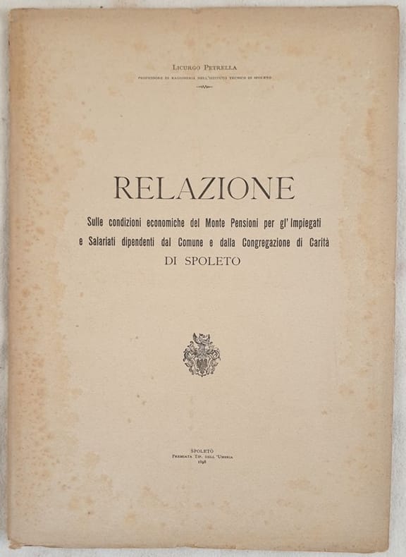 Interessante pubblicazione del 1898, le condizioni economiche del Monte Pensioni per gli impiegati e salariati del comune di Spoleto scritto da Licurgo Petrella. In ottime condizioni. Copertina editoriale in ottime condizioni generali con lievi usure ai margini e dorso. Legatura in buone condizioni. All'interno le pagine si presentano in ottime condizioni con rare fioriture. In 4. Dim. 29,5x21,5 cm. Pp. 52. Interesting pamphlet of 1898, economical conditions of Monte Pensioni of the comune of Spoleto written by Licurgo Petrella. In very good conditions. Editorial cover in very good general conditions slightly worn in the edges and spine. Binding in good conditions. Inside pages are in very good conditions with occasional foxings. In 4. Dim. 29,5x21,5 cm. Pp. 52.
