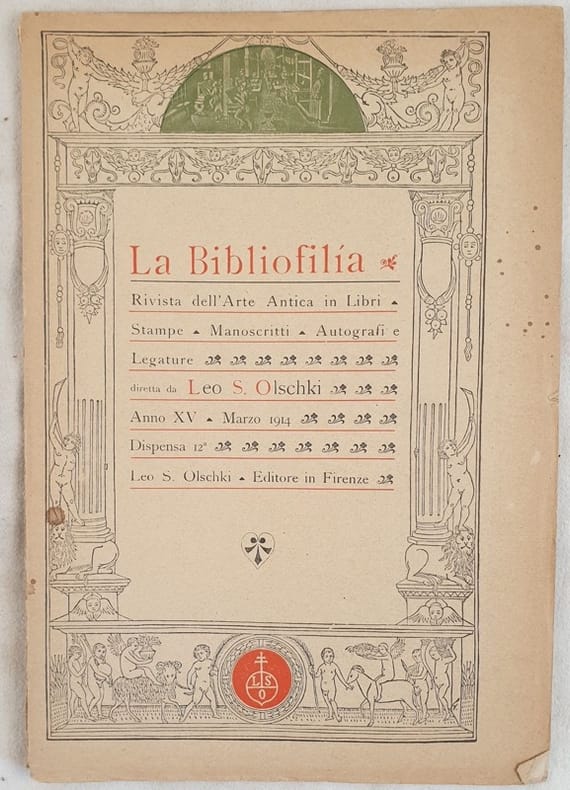 Numero del marzo 1914 della rivista "La Bibliofilia" rivista dell'arte antica fondata nel 1899 da Leo Olschki. Tra gli articoli presenti: A proposito di alcune stampe italiane inedite della raccolta Malaspina, Francesco Puteolano e le origini della stampa a Bologna e PArma, Bibliografia dell'aria, Pubblicazioni di carattere bibliografico e intorno alla storia dell'arte tipografica ecc... Alcune illustrazioni. In buone condizioni. Copertina editoriale in buone condizioni con usure e parti mancanti ai margini e dorso. Legatura in discrete condizioni con rotture. All'interno le pagine si presentano in ottime condizioni con rare fioriture. In 4. Dim. 30x20,5 cm. Pp. from 445 to 484.Number of march 1914 of the magazine "La Bibliofilia" magazine of ancient art established in 1899 by Leo Olschki. Between the articles inside: Some italian inedit prints of the collection Malaspina, Francesco Puteolano and origins in printing in Bologna and PArma, Bibliography of the air, Pubblication of bibliography and about typographycal art etc... Some illustrations. In good conditions. Editorial cover in good conditons with wearings and missing parts in the edges and spine. Binding in fair conditions with cracks. Inside pages are in very good conditions with occasional foxings. In 4. Dim. 30x20,5 cm. Pp. 44.