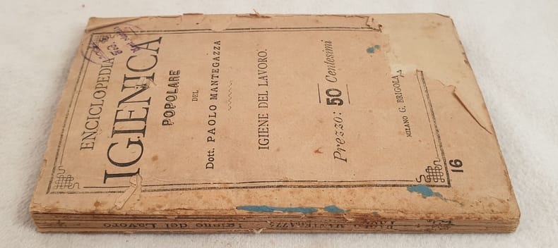 Edizione del 1881 di questa opera sull'igiene del lavoro del medico, antropologo, patriota e politico Paolo Mantegazza (Monza 1831-1910). Lo scritto faceva parte del fortunato "Almanacco igienico popolare" pubblicato in diversi volumi dal 1866 al 1905. L'autore descrive diverse professioni: Il lavoro e le professioni, il barcaiuolo, scleta del mestiere, il riposo della domenica, la legeg per regolare il lavoro dei fanciulli, professioni sedentarie, professioni muscolari (contadini, giardinieri, facchini fabbri fornai fonditori, inno ai cuochi, falegnami, conciatori e concie, minatori, palombari e l'arte della paglia, professioni velenose, professioni polverose, soldati e marinai ecc... Interessanti appendice: Latteria lombarda, Acque minerali di San Bernardino nel Cantone del Grigioni, Peptone prpearato con la carne, Acque ferruginose di Santa Caterina presso Bormio (Valtellina)Apparato salvagente di G. A. Birt, Acque di Vals, Vincenzo Ricasoli, Tessuti coperte da letto amamche di seta di Gaetano Aducci di Forli, Farmacia di San Marco Firenze via Cavour elisir di China coca otima, Prodotti della nuova fabbrica di profumerie di A. D. Pierrugues in Firenze via Fiorenzuola via Maffei, Boscolungo sull'Abetone, Acqua purgativa di Pullina in Boemia. Segue cenni sulla statistica di mortalita e morbosita degli operai. Infine alimentazione dei contadini lombardi. In buone condizioni.Copertina editoriale in mediocri condizioni generali con usure e parti mancanti ai margini e dorso. Legatura in discrete condizioni con rotture. All'interno le pagine si presentano in buone condizioni con fioriture. In 16. Dim. 14,5x10 cm. Pp. 168+28. Edition of 1881 of this work about hygiene of work by the anthropologist, patriot and politican Paolo Mantegazza (Monza 1831-1910). the volume was part of "Almanacco igienico popolare" published in different volumes from 1866 to 1905 the author describes many jobs and its problems. Interesting appendix: Latteria lombarda, Acque minerali di San Bernardino nel Cantone del Grigioni, Peptone prpearato con la carne, Acque ferruginose di Santa Caterina presso Bormio (Valtellina)Apparato salvagente di G. A. Birt, Acque di Vals, Vincenzo Ricasoli, Tessuti coperte da letto amamche di seta di Gaetano Aducci di Forli, Farmacia di San Marco Firenze via Cavour elisir di China coca otima, Prodotti della nuova fabbrica di profumerie di A. D. Pierrugues in Firenze via Fiorenzuola via Maffei, Boscolungo sull'Abetone, Acqua purgativa di Pullina in Boemia. Statistics of death and deseases of workers. At the end food of peasants from Lombardia. In good conditions. Editorial cover in poor general conditions with wearings and missing parts in the edges and spine. Binding in fair conditions with cracks. Inside pages are in good conditions with foxings. In 16. Dim. 14,5x10 cm. Pp. 168+28.