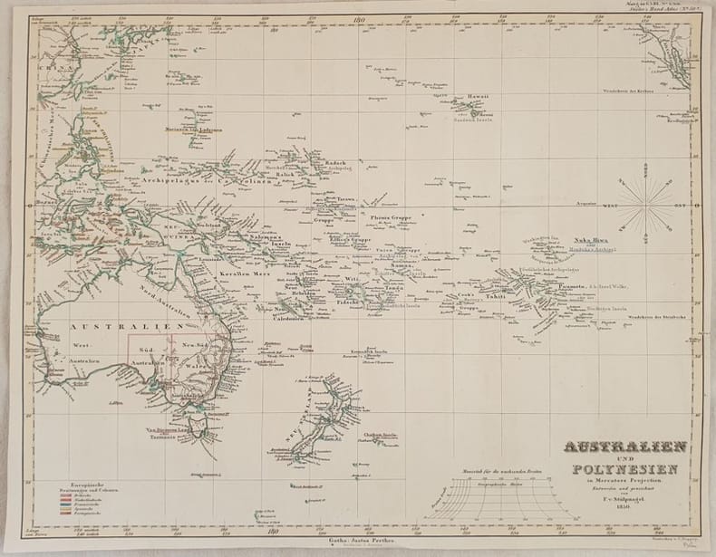 Mappa del 1850 di Australia e Polinesia di F. V. Stulpnagel. Autore: F. V. Stulpnagel Data: 1850 Tecnica: Incisione su rame Dimensione della pagina: 31x39,5 cm Dimensione dell'incisione: 30x38,5 cm Condizioni: Ottime Map of 1850 of Australia and Polinesia by F. V. Stulpnagel. Author: F. V. Stulpnagel Date: 1850 Technique: copper engraving Leaf Dimension: 31x39,5 cm Engraving Dimension: 30x38,5 cm Conditions: Very good conditions.