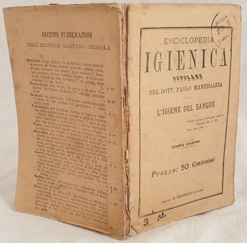 Edizione del 1881 di questa opera sull'igiene del sangue del medico, antropologo, patriota e politico Paolo Mantegazza (Monza 1831-1910). Lo scritto faceva parte del fortunato "Almanacco igienico popolare" pubblicato in diversi volumi dal 1866 al 1905. L'autore descrive il sangue, malattie e problemi correlati, salassi, ginanstica rspiratoria, i veleni del sangue, Filippica contro le magie di ogni forma e colore, anatomia ecc... Interessante l'appendice finale sulla distribuzione della tisi in alcune città d'Italia In buone condizioni. Copertina editoriale in mediocri condizioni generali con usure e parti mancanti ai margini e dorso. Legatura in discrete condizioni con rotture. All'interno le pagine si presentano in buone condizioni con fioriture. In 16. Dim. 15,5x10 cm. Pp. 150+(2). Edition of 1881 of this work about hygiene of blood by the anthropologist, patriot and politican Paolo Mantegazza (Monza 1831-1910). the volume was part of "Almanacco igienico popolare" published in different volumes from 1866 to 1905 The author describes blood, deseases, breathing gymnastics, poisons of blood, Speech against any kind of magic ecc... IOnteresting the final appendix about distribution of tisis in some italian cities In good conditions.Editorial cover in poor general conditions with wearings and missing parts in the edges and spine. Binding in fair conditions with cracks. Inside pages are in good conditions with foxings. In 16. Dim. 15,5x10 cm. Pp. 150+(2).