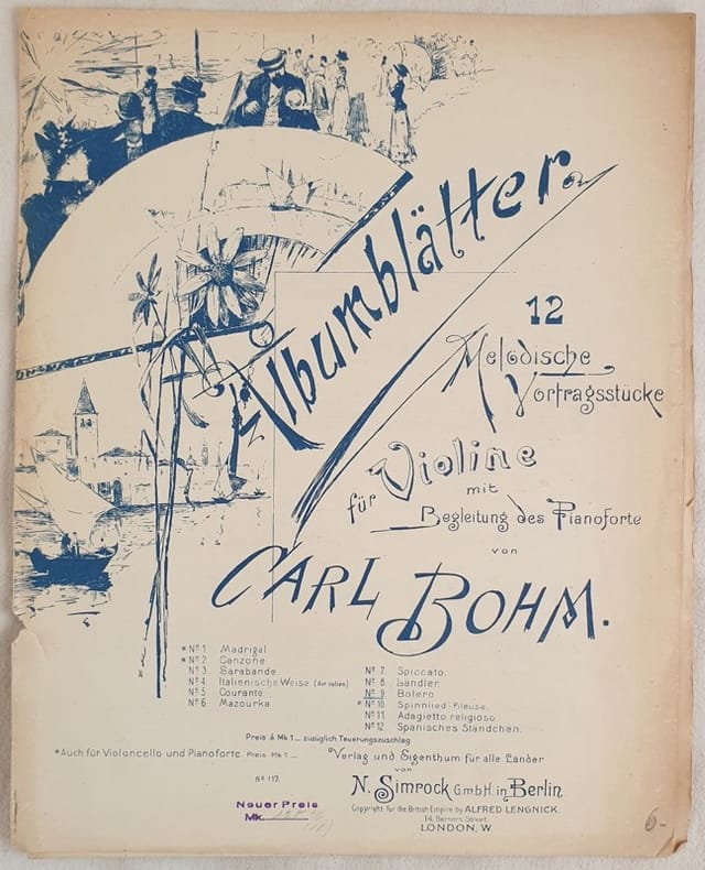 Bello spartito di fine ottocento della melodia "Bolero" per violino e pianoforte del compositore e pianista tedesco Carl Bohm (1844-1920). All'interno partitura per violino, violino e pianoforte insieme. Bella illustrazione in copertina. In ottime condizioni. Copertina editoriale in ottime condizioni con lievi usure ai marginie dorso. Legatura editorialmente assente. Pagine in ottime condizioni con fioriture. In folio. cm. 34x27,5. Pp. 4+3. Beautiful musical score of late 19th century of the melody "Bolero" for violin and piano by the german pianist and composer Carl Bohm (1844-1920). Inside score for violin, violina nd piano together. Beautiful illustration i the cover. In very good conditions. Editorial cover in very good conditions slightly worn in the edges and spine. Binding is editoriarly missing..Pages in very good conditions with occasional foxings. In folio. cm. 34x27,5. Pp. 4+3.