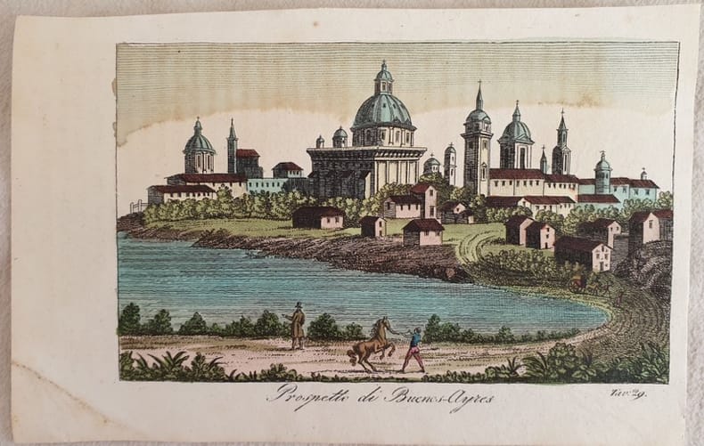 Deliziosa veduta animata colorata a mano del 1824 della città di Buenos Aires in Brasile. Autore: Giulio Ferrario (1767-1847) Atlante: Il costume antico e moderno o storia del governo Firenze, Vincenzo Batelli e Compagni Data: 1824 Tecnica: Incisione su rame colorata a mano Dimensione della pagina: 20,5x13 cm Dimensione dell'incisione: 16,5x10,5 cm Condizioni: BuonePrint of 1824 coloured by hand representing the Hindu God Trimurti, Shiva, Vishnu, Brama, Kamadeva. Author: Giulio Ferrario (1767-1847) Atlas: Il costume antico e moderno o storia del governo Firenze, Vincenzo Batelli e Compagni Date: 1824 Technique: Copper etching coloured by hand Page Dimension: 20,5x13 cm Engraving Dimension: 16,5x10,5 cm Conditions: Good conditions. Occasional foxings.