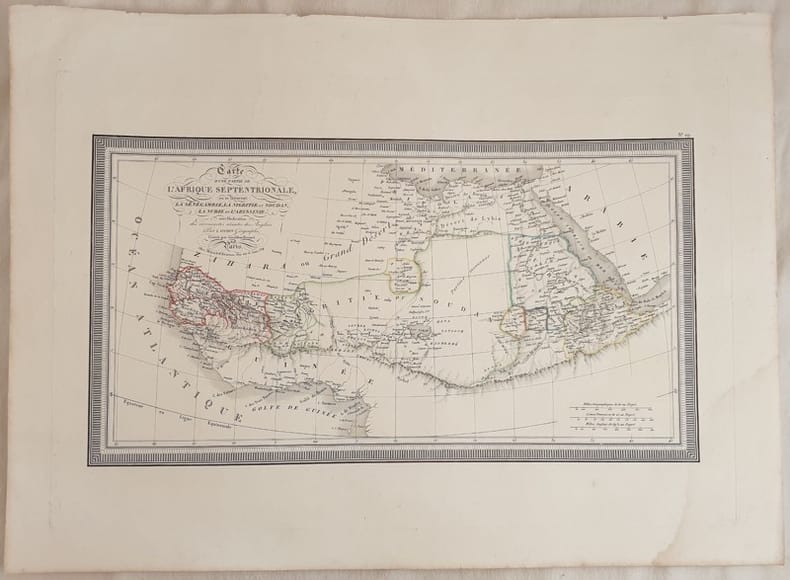 Mappa del 1826 dell'Africa settentrionale: Senegal, Gambia, Nigeria, Uganda, Tanzania, Kenya Sudan, Nubia, Etiopia. Autore: L. Vivien Data: 1826 Tecnica: Incisione su rame Dimensione della pagina: 57,5x42 cm Dimensione dell'incisione: 50,5x34 cm Condizioni: Buone. Gora d'umidità all'angolo inferiore destro. Map of 1826 of ouest Africa: Senegal, Gambia, Nigeria, Uganda, Tanzania, Kenya Sudan, Nubia, Aethiopia. Author: L. Vivien Date: 1826 Technique: copper engraving Leaf Dimension: 57,5x42 cm Engraving Dimension: 50,5x34 cm Conditions: Good conditions. Water stain in the lower right corner