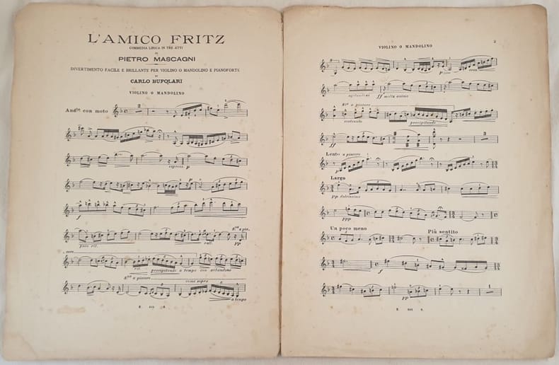 Bello spartito senza data ma degli anni 30 di questo spartito per mandolino o violino con accompagnamento di pianoforte della melodia "divertimento facile e brillante" dall'opera "L'Amico Fritz" di Pietro Mascagni adattato da Carlo Bufolari. Presente partitura per mandolino o violino. In buone condizioni. Copertina muta in buone condizioni con lievi usure ai margini e dorso. Legatura editorialmente assente. Pagine in ottime condizioni con rare fioriture. In folio. cm. 37x27,5. Pp. 6. Beautiful musical score of 1930's of this musical score for mandolin and piano of the melody "divertimento facile e brillante" from the work "L'Amico Fritz" by Pietro Mascagni adapted by Carlo Bufolari. there is score for violin or mandolin. In good conditions. Editorial cover in good conditions slightly worn in the edges and spine. Binding is editoriarly missing. Pages in very good conditions with occasional foxings. In folio. cm. 37x27,5. Pp. 6.