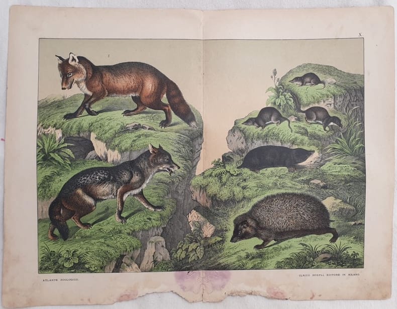 Bella incisione in cromolitografia del 1890 circa che rappresenta: sciacallo, riccio, toporagno, talpa Planche estratta da libro. AUTORE: Ferdinando Sordelli ATLANTE: Storia naturale dei mammiferi. Milano Ulrico Hoepli editore <BR>TECNICA: Cromolitografia DIMENSIONI FOGLIO: cm 33x42,5 DIMENSIONI INCISIONE: cm 26x36 EPOCA: 1890 circa In discrete condizioni, qualche fioritura. Gora d'umidità e parti mancanti al margine inferiore.Nice chromolythograph of 1890 circa representing: jackal, hedgedog, shrew, capacity<BR>Planche removed from a book In fair conditions, foxings. Water stain missing parts in the lower edge. AUTHOR: Ferdinando Sordelli ATLANTE: Storia naturale dei mammiferi. Milano Ulrico Hoepli editore TECHNIQUE: chromolythography LEAF SIZE: cm 33x42,5 PRINT'S SIZE: cm 26x36 PERIOD: 1890 circa