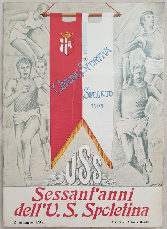 Interessante pubblicazione del 2 Maggio 1971 edita in occasione dei 60 anni dell'Unione Sportiva Spoletina a cura di Antonio Busetti. La pubblicazione ripercorre la storia dell'Unione Sportiva negli anni con numerose foto d'epoca. Tra gli articoli presenti: Costante Girardengo, gli atleti dell'U.S. spoletina e le loro affermazioni dal 1909 al 1970, i cosnigli direttivi dal 1909 al 1968, soci onorari, alcuni tesserati negli anni 1970 1971, Alceo Rambaldi e Marino Monti, sport esportivi spoletini di altri tempi, Giuseppe Lisi, Ranieri di Campello, la settimana nazioanle del Veterano Sportivo, i marciatori spoletini a Monteluco ecc.... In ottime condizioni. Copertina editoriale in ottime condizioni generali con lievi usure ai margini e dorso. Legatura in ottime condizioni. All'interno le pagine si presentano in ottime condizioni. In 4. Dim. 29,5x21,5 cm. Pp. 44. Interesting pamphlet of 2nd of May 1971 edited in occasion of 60 years of theUnione Sportiva Spoletina by Antonio Busetti. The pamphlet describes the history of the Unione Sportiva in the years with different photoes of that time. Between the articles inside: Costante Girardengo, the atlets of the U.S. spoletina abd their affirmations from 1909 until 1970, the directive councils from 1909 until 1968, honorary associates, Alceo Rambaldi and Marino Monti, Giuseppe Lisi, Ranieri di Campello, the national week of Veterano Sportivoecc.... In very good conditions. Editorial cover in very good general conditions slightly worn in the edges and spine. Binding in very good conditions. Inside pages are in very good conditions In 4. Dim. 29,5x21,5 cm. Pp. 44.
