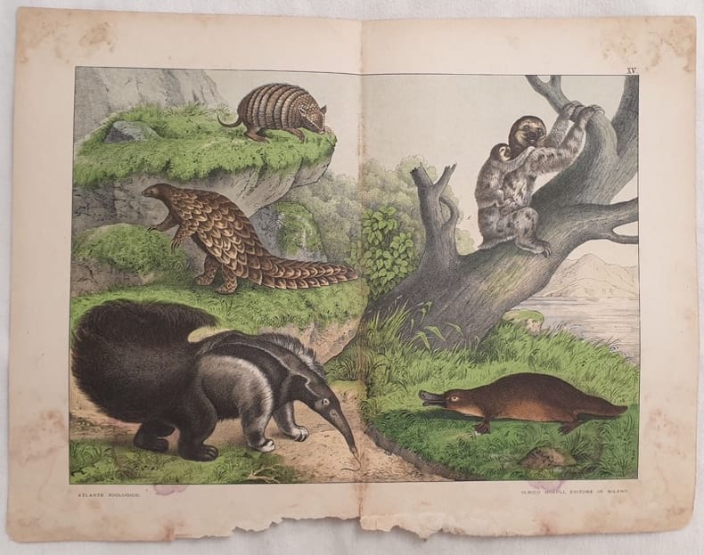Bella incisione in cromolitografia del 1890 circa che rappresenta: formichiere pangolino, armadillo, bradipo, ornitorinco Planche estratta da libro. AUTORE: Ferdinando Sordelli ATLANTE: Storia naturale dei mammiferi. Milano Ulrico Hoepli editore TECNICA: Cromolitografia DIMENSIONI FOGLIO: cm 33x42,5 DIMENSIONI INCISIONE: cm 26x36 EPOCA: 1890 circa In discrete condizioni, qualche fioritura. Gora d'umidità e parti mancanti al margine inferiore Nice chromolythograph of 1890 circa representing: ant bear, pangolin, armadillo, sloth, platypus<BR>Planche removed from a book In fair conditions, foxings. Water stain missing parts in the lower edge. AUTHOR: Ferdinando Sordelli ATLANTE: Storia naturale dei mammiferi. Milano Ulrico Hoepli editore TECHNIQUE: chromolythography LEAF SIZE: cm 33x42,5 PRINT'S SIZE: cm 26x36 PERIOD: 1890 circa