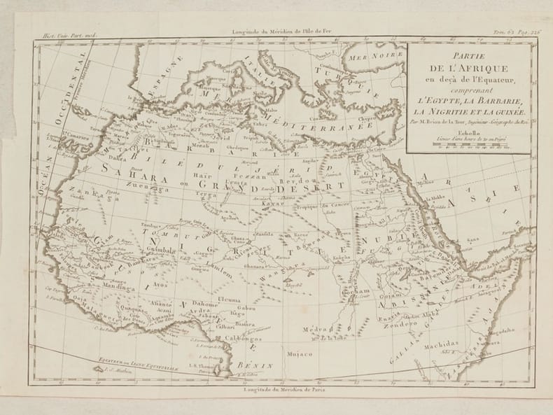 Mappa dettagliata del 1760 circa del geografo francese Brion de la Tour che mostra nord centrale Africa dal Marocco, Egitto, Sudan, Etiopia, dal Niger alla Guinea. La mappa contine numerosi dettagli e annotazioni riguardanti recenti esplorazioni. Autore: Brion de La Tour (1743-1803) Data: 1760 circa Tecnica: incisione su rame Dimensione foglio: 26x38,5 cm Dimensione dell'incisione: 25x34 cm Condizioni: buone. Piegatura verticale Detailed map of 1760 circa by the French geographer Brion de la Tour featuring North Central Africa from Morocco, Egypt, Sudan, Ethiopia, Niger to Guinea. The map is filled with details and notations concerning recent explorations. Author: Brion de La Tour (1743-1803) Date: 1760 circa Technique: etching on copper Leaf Dimension: 26x38,5 cm (10.2x15.2 inches) Engraving Dimension: 25x34 cm (9.8x13.4 inches) Conditions: Good conditions. Vertical foldings.