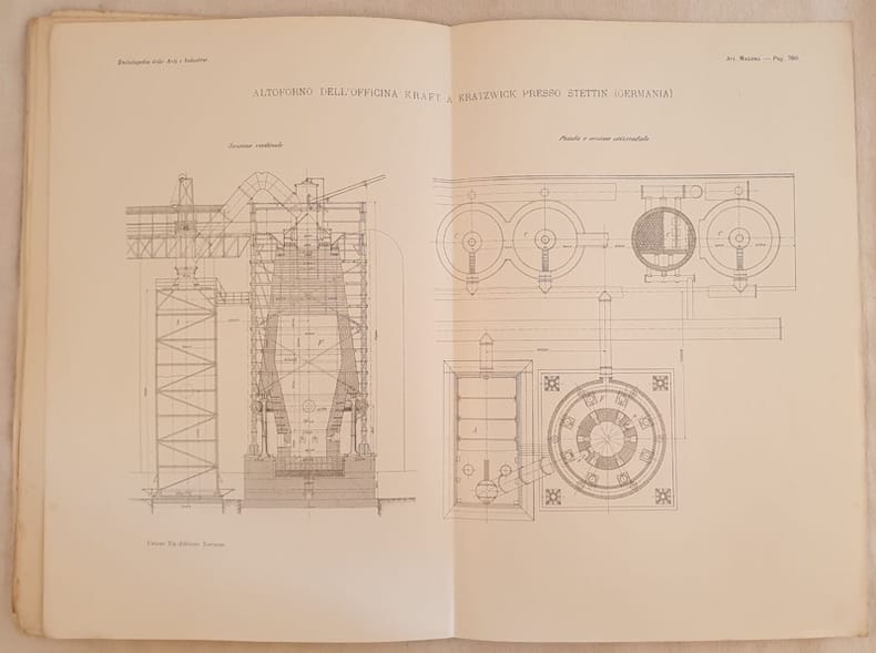 Interessante estratto del 1889 circa tratto dall'Enciclopedia delle arti e industrie edita da Utet sulla magona scritto dall'Ing. T. Nuti Lazzerini. Nella prima parte è presente il magnano ma scompleto (mancano alcune prime pagine iniziali) La parte relativa alla magona consta di 27 pagine ed è completo, Il magnano di 20 pagine ma è scompleto. Alla fine planche che mostra altoforno dell'Officina Kraft a Kratzwick presso Stettin in Germania. L'autore descrive la lavorazione della magona e le officine. In ottime condizion Copertina assente. Legatura in buone condizioni. All'interno le pagine si presentano in ottime condizioni con rare fioriture. In 4. Dim. 31x20,5 cm. Pp. da 729 a 774.Interesting extract of 1889 circa from Enciclopedia delle arti e industrie edited by Utet about magona written by T. Nuti Lazzerini. In the first part there is the magnano but scomplete (the first pages are missing)The part relating magona is made up of 27 pages and it is complete, the magnano of 20 pages and is not complete. At the end planche showing the oven of Officina Kraft in Kratzwick near Stettin in Germany. In very good conditions. Cover is missing. Binding in good conditions. Inside pages are in very good conditions with occasional foxings. In 4. Dim. 31x20,5 cm. Pp. from 729 to 774.