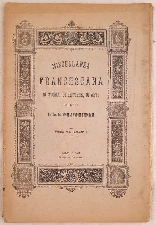 Numero del gennaio febbraio 1901 della rivista "Miscellanea Francescana" rivista di scienze teologiche e studi francescani. Tra gli articoli presenti: Codices Italicae conscripti, S. Bonaventura, Fra Roberto da Lecce, Francescano anonimo, Panziera Ugo, Clarisse di Bologna, La leggenda del B. Benedetto di Arezzo, La Via Crucis, Relazione Istorica sul martirio del P. Innocenzo da Roma, Sacrum Commecium Beati Francisci, Lo Speculum prfetionis e la sua data, Lucrezia della Gengafondatrice di un Monastero francescano in Todi, Studi francescani in Germania ecc... In buone condizioni. Brossura editoriale in buone condizioni generali con lievi usure ai margini e dorso. Legatura in buone condizioni. All'interno le pagine si presentano in ottime condizioni con rare fioriture. In 4. Dim. 29,5x20 cm. Pp. 48. Number of january february 1901 of the magazine "Miscellanea Francescana" magazine of theological studies and franciscan studies. The articles inside: Speculum perfectionis pubblicato da Paolo Sabatier, The new union of minor friars, New observations about Cantico del sole, The Blessed Pacifico di Novara, L'Umbria serafica del P. Agostino da Stroncone ecc... In good conditions. Editorial cover in good conditions slightly worn in the edges and spine. Binding in good conditions. Pages are in very good conditions with occasional foxings. In 4. Dim. 29,5x20 cm. Pp. 32.