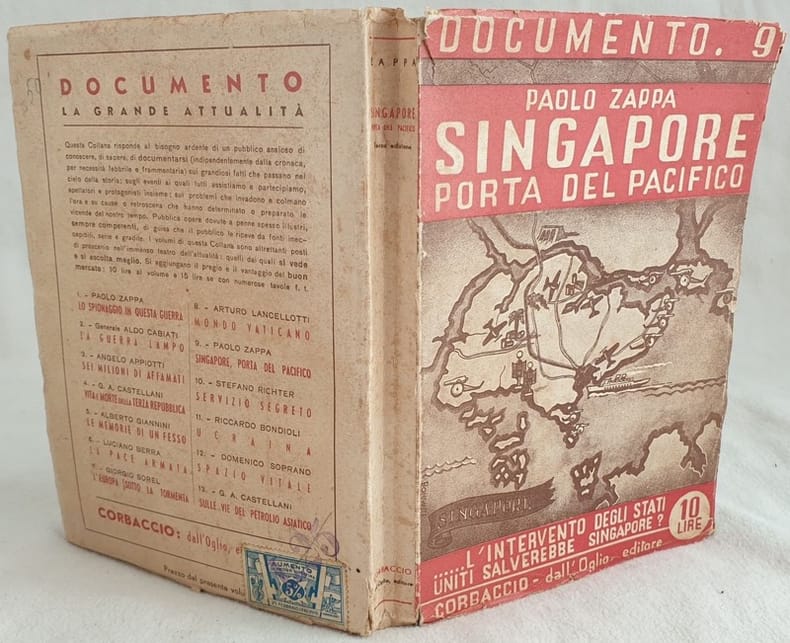 Terza edizione del 1942 di questa interessante opera del giornalista e scrittore Paolo Zappa (1899-1950). Il volume è completamente dedicato a Singapore. Tra gli argomenti trattati: Il Mare britannicum, La citta del Leone, In giro peer Singapore, Il primo allarme, La spinta verso nord, continente vuoto, Isole della sonda, Vietnam, I cannoni sotto le palme, Il porto da guerra, La marcia, Il paese degli uomini liberiu, Gli Stati Uniti in Estremo Oriente, La flotta americana arrivera a Singapore, All'ora H di Singapore ecc... Alcune mappe all'interno: Istmo di Kra, Singapore, distanze fra il continente e le basi degli Stati Uniti nel Pacifico. In buone condizioni. Brossura editoriale originale in buone condizioni con lievi usure ai margini e dorso. Legatura in buone condizioni. All'interno le pagine si presentano in ottime condizioni con rare fioriture. In 8. Cm 19,5X14. Pp. 268+(4) Third edition of 1942 of this interesting work by the journalist and writer Paolo Zappa (1899-1950). The work is completely dedicated to Singapore. Between the issues treated: Sea britannicum, In tour for Singapore, The first alarm, Vietnam, Harbour war, March, United States in Far East, Amrican boat in Singapore, H hour in Singapore ecc... Alcune mappe all'interno: Istmo di Kra, Singapore, distnaces between continents and bases of United States in Pacific sea. In good conditions. Editorial cover in good general conditions slightly worn in the edges and spine. Binding in good conditions. Inside pages are in very good conditions with occasional foxings. In 8. Cm 19,5X14. Pp. 268+(4)<BR><BR>