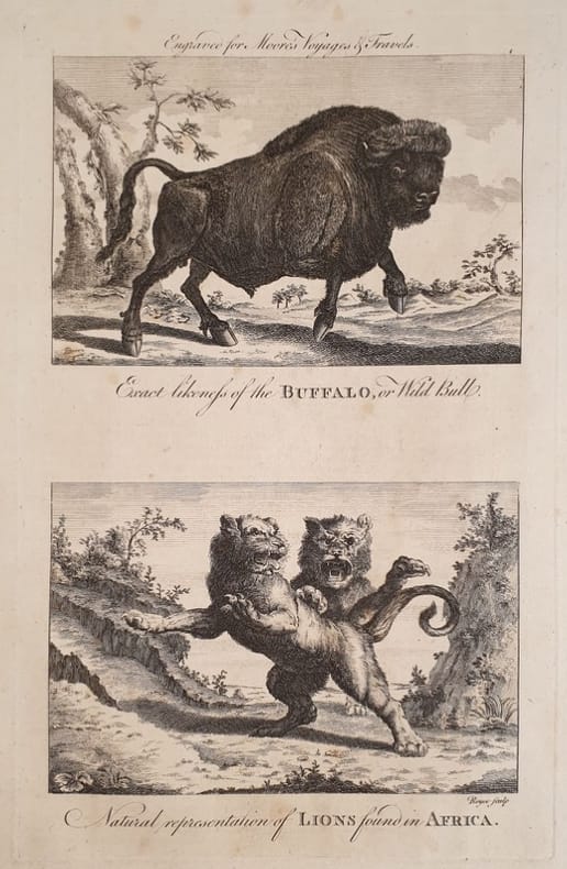Bella incisione del 1778 circa che mostra un bisonte e due leoni nella savana africana. Planches estratte da libro. ATLANTE: Moore's Voyages and travels AUTORE: Royce TECNICA: Xilografia DIMENSIONI FOGLIO: cm 36,5x23 DIMENSIONI INCISIONE: cm 28,5x18,5 EPOCA: 1778 circa. In buone condizioni, qualche fioritura Beautiful plate of 1778 circa showing a buffalo and two lions in African savana. Plates extracted from a book. In good conditions, foxings. ATLAS: Moore's Voyages and travels AUTHOR: Royce TECHNIQUE: woodcut LEAF SIZE: cm 36,5x23 PRINT'S SIZE: cm 28,5x18,5 PERIOD: 1778 circa. In good conditions, some foxings