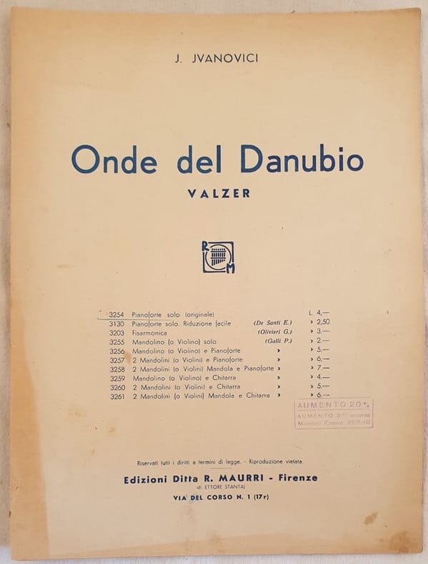 Spartito degli anni '40 della canzone Onde del Danubio del compositore J. Jvanovici.<BR>All'interno partitura per pianoforte. Note manoscrittte a matita. In discrete condizioni con fioriture, usure e strappi marginali. Formato cm. 33,5x25. Pp. 7.Beautiful musical score of 1940's of the song Onde del Danubio by the composer J. Jvanovici Handwritten notes with pencil. Inside musical score for piano. In good conditions with foxings, wearings, tears. Size cm. 33,5x25. Pp. 7.