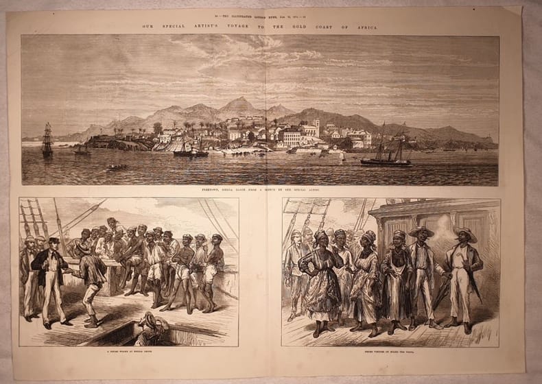 Xilografia originale del 1874 che mostra Freetown nel Sierra Leone. La stampa mostra la veduta di Freetown in Sierra Leone. Alcune persone di colore in uno sciopero in Sierra Leone a bordo della Volta. Supplemento al Illustrated London news, 10 gennaio 1874. Veduta di grande dimensioni. Autore: Anonymous Data: 1874 Tecnica: xilografia Dimensione foglio: 56x40 cm Dimensione dell'incisione: 52,5x34 cm Condizioni: Ottime. Piegatura verticale Original woodcut of 1874 featuring Freetown in Sierra Leone. The print shows the view of Freetown in Sierra Leone. Some black people in a strike in Sierra Leone and visiting on board the Volta. Supplement to the Illustrated London news, January 10th 1874. Big size. Author: Anonymous Date: 1874 Technique: woodcutLeaf Dimension: 56x40 cm (22x15.7 inches) Engraving Dimension: 52,5x34 cm (20.7x13.4 inches) Conditions: Very good conditions. Vertical folding.