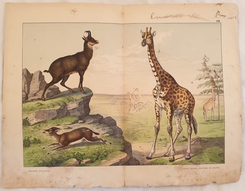 Bella incisione in cromolitografia del 1890 circa che rappresenta: Sassa, camoscio, gazzella, giraffa.<BR> Planche estratta da libro. AUTORE: Ferdinando Sordelli ATLANTE: Storia naturale dei mammiferi. Milano Ulrico Hoepli editore TECNICA: Cromolitografia DIMENSIONI FOGLIO: cm 33x42,5 DIMENSIONI INCISIONE: cm 26x36 EPOCA: 1890 circa In discrete condizioni, qualche fioritura. Gora d'umidità e parti mancanti al margine inferiore. Segni manoscritti a penna Nice chromolythograph of 1890 circa representing: Clipspringer, Chamois, Gazelle<BR>Planche removed from a book In fair conditions, foxings. Water stain missing parts in the lower edge. Signs with pen. AUTHOR: Ferdinando Sordelli ATLANTE: Storia naturale dei mammiferi. Milano Ulrico Hoepli editore TECHNIQUE: chromolythography LEAF SIZE: cm 33x42,5 PRINT'S SIZE: cm 26x36 PERIOD: 1890 circa