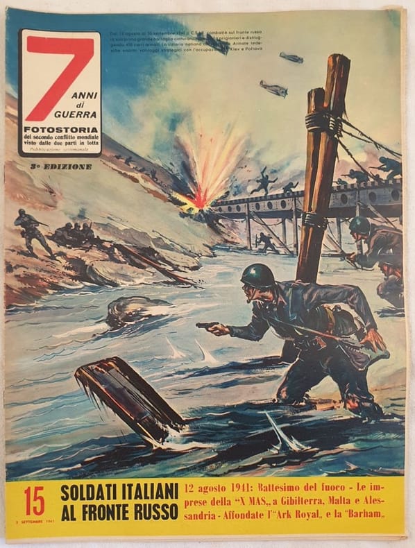 Numero del 3 settembre 1961 della pubblicazione settimanale "7 anni di guerra" fotostoria del secondo conflitto mondiale attraverso una rara e copiosa documentazione fotografica.<BR>In questo numero la fotostoria degli avvenimenti del 22, 30 settembre, 18 agosto 1941, 12 e 25 novembre 1941, 25-26 luglio 1941, 19 dicembre 1941. Tra gli articoli presenti: Soldati italiani al fronte russo, Unita del CSIR in partenza per il lontano fronte russo, L'attacco alla steppa, L'opera dell'Aviazione, La Russia in armi, U-boote in mediterraneo, La X Mas all'attacco ecc... n buone condizioni. Copertina editoriale in buone condizioni generali con lievi usure ai margini e dorso. Legatura in buone condizioni. All'interno le pagine si presentano in ottime condizioni con rare fioriture. In folio. Dim. 36x27 cm. Pp. da 338 a 358+(2). Number of 3rd of september 1961 of the weekly magazine "7 anni di guerra" photo chronicle of seconf world war througha scarce and rich photos collection.<BR>In this number the photostory of happenings of 22, 30 settembre, 18 agosto 1941, 12 e 25 novembre 1941, 25-26 luglio 1941, 19 dicembre 1941. Inside: Italian soldiers in Russian front, CSIR leaving to russian front, Aviation, Russia in arms, U-boote in mediterranean, X Mas ecc... In good conditions. Editorial cover in good general conditions slightly worn in the edges and spine. Binding in good conditions. Inside pages are in very good conditions with occasional foxings. In folio. Dim. 36x27 cm. Pp. from 338 to 358+(2).