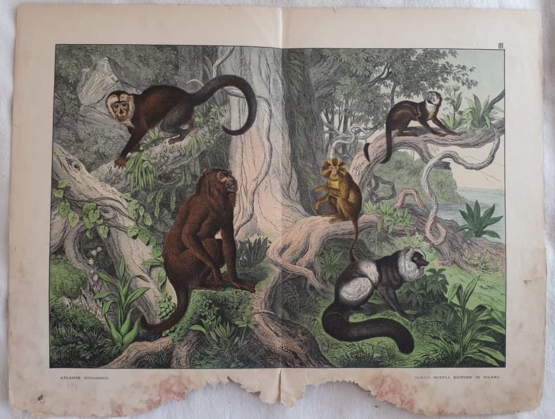 Bella incisione in cromolitografia del 1890 circa che rappresenta: Sai (Cebus capucinus), Saju (Cebus apella), Saimiri (Callithrix sciurea), Scimia leonina (Hapale rosalia) Planche estratta da libro. AUTORE: Ferdinando Sordelli ATLANTE: Storia naturale dei mammiferi. Milano Ulrico Hoepli editore TECNICA: Cromolitografia DIMENSIONI FOGLIO: cm 33x42,5 DIMENSIONI INCISIONE: cm 26x36 EPOCA: 1890 circa In discrete condizioni, qualche fioritura. Gora d'umidità e parti mancanti al margine inferiore. Nice chromolythograph of 1890 circa representing: White-faced capuchin (Cebus capucinus), Tafted capuchin (Cebus apella), Squirrell monkey (Callithrix sciurea), Silky marmoset (Hapale rosalia)<BR>Planche removed from a book In fair conditions, foxings. Water stain missing parts in the lower edge. AUTHOR: Ferdinando Sordelli ATLANTE: Storia naturale dei mammiferi. Milano Ulrico Hoepli editore TECHNIQUE: chromolythography LEAF SIZE: cm 33x42,5 PRINT'S SIZE: cm 26x36 PERIOD: 1890 circa