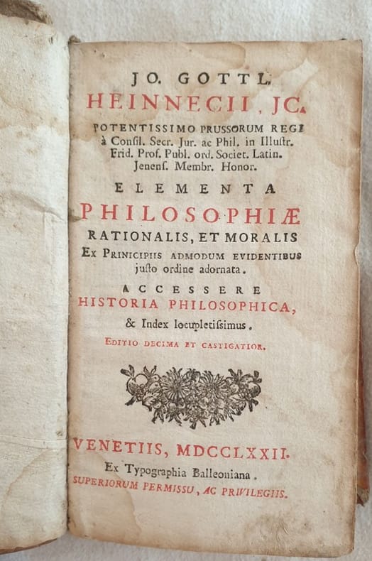 Edizione veneziana del 1772 di questa opera filosofica scritta da Johann Gotllieb Heinecke (1681-1741) noto giurista tedesco e professore ad Halle. L'opera è in un volume ed è completa. L'opera riguarda in particolare la storia della filosofia e la filosofia razionale e morale. In mediocri condizioni. Copertina in piena pergamena coeva con titolo manoscritto al dorso in discrete condizioni con usure e parti mancanti ai margini e dorso. Legatura in mediocri condizioni ma corpo del libro in parte staccato. Pagine in discrete condizioni con fioriture e lievi gore d'umidità marginali. In 16. Cm 16,5x9,5. Pp. 352. Venetian edition of 1772 of this phylosophical work written by Johann Gotllieb Heinecke (1681-1741) famous german jurist and teahcer in Halle. The work is in one volume and it is complete. the work relates in particular the history of phylosophy and rational and moral phylosophy. In poor conditions. Parchment cover with handwritten title in the spine in fair conditions with wearings and missing parts in the edges and spine. Binding in poor conditons but the body of the book partially detached. Pages in fair conditions with foxings and light dump stains in the edges. In 16. Cm 16,5x9,5. Pp. 352.