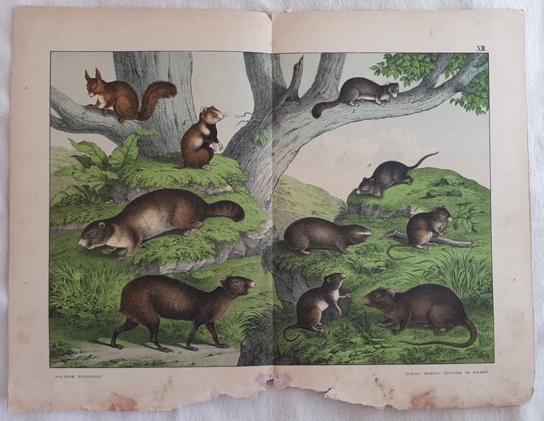 Bella incisione in cromolitografia del 1890 circa che rappresenta: aguti (Dasyprocta aguti), Hamster (Cricetus frementatius), Scoiattolo (Sciurus vulgaris), ghiro (Myoxus glis), topo campagnolo (Arvicola arvalis), Sorcio o topolino (Mus musculus), Topo delle fogne (Mus decumanus), Topo boschereccio (Mus sylvaticus), Zemmi (Spalax typhlus) Planche estratta da libro. AUTORE: Ferdinando Sordelli ATLANTE: Storia naturale dei mammiferi. Milano Ulrico Hoepli editore TECNICA: Cromolitografia DIMENSIONI FOGLIO: cm 33x42,5 DIMENSIONI INCISIONE: cm 26x36 EPOCA: 1890 circa In discrete condizioni, qualche fioritura. Gora d'umidità e parti mancanti al margine inferiore Nice chromolythograph of 1890 circa representing: agouty (Dasyprocta aguti), Hamster (Cricetus frementatius), Squirrell (Sciurus vulgaris), Dormhouse (Myoxus glis), common vole (Arvicola arvalis), House mouse (Mus musculus), Brown rat (Mus decumanus), Wood mouse (Mus sylvaticus), Greater Mole Rat (Spalax typhlus) <BR>Planche removed from a book In fair conditions, foxings. Water stain missing parts in the lower edge AUTHOR: Ferdinando Sordelli ATLANTE: Storia naturale dei mammiferi. Milano Ulrico Hoepli editore TECHNIQUE: chromolythography LEAF SIZE: cm 33x42,5 PRINT'S SIZE: cm 26x36 PERIOD: 1890 circa