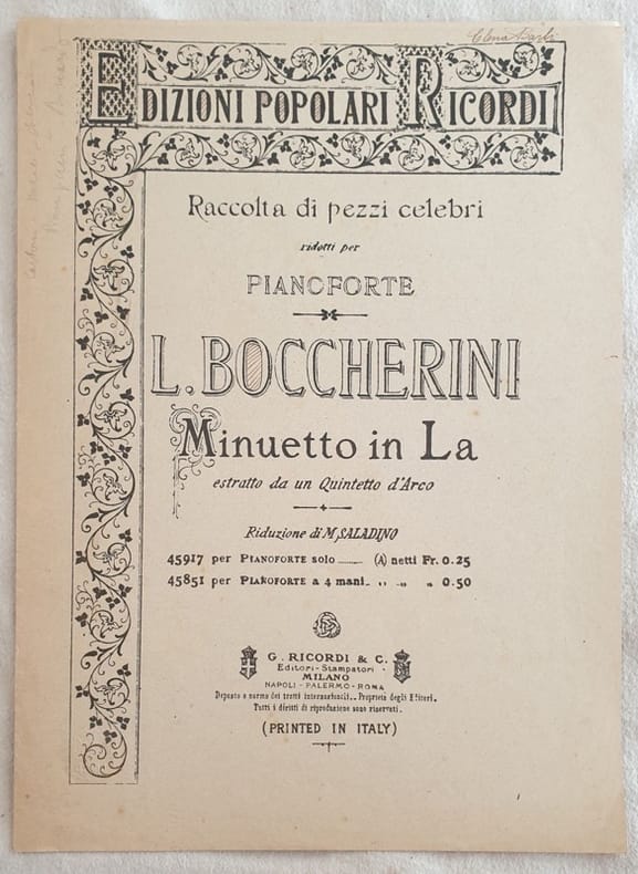 Edizione dell'aprile 1910 di questo spartito per pianoforte del compositore Boccherini "Minuetto in La" estratto da un quintetto d'arco. Ottime condizioni. Legatura in buone condizioni. In 4. cm 27,5x20. pp. 3. Edition of april 1910 of this musical score for piano by the composer Boccherini "Minuetto in La" estratto da un quintetto d'arco. Very good conditions. Binding in good conditions. In 4. cm 27,5x20. pp. 3.