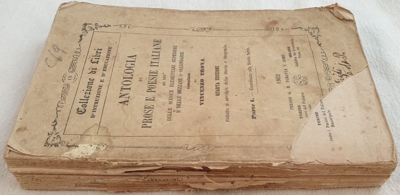 Edizione del 1862 di questa antologia di prose e poesie italiane ad uso delle scuole elementari scritto da Vincenzo Troya. Siamo in possesso della parte prima solamente sulla storia sacra. All'interno: Avvertimenti morali, preghiere (Perifrasi del Pater Noster, Ave Maria, Cantici peer la Comunione, Inno a Dio, la Patria celeste), Prose e poesie descrittive, Creazione, Regno vegetale, Regno animale, uomo e angeli, brani di argomento storico ecc... In discrete condizioni. Copertina editoriale in mediocri condizioni con usure e parti mancanti ai margini e dorso. Piatto posteriore mancante. Legatura quasi assente. Pagine in discrete condizioni con fioriture e lievi gore d'umidità marginali. Qualche pagina finale dellindice mancante. In 8. Cm 20x12,5. Pp. XVI Edition of 1862 of this anthology of italian proses and poems for the usage of primary schools written by Vincenzo Troya. We only have the first part about holy history. Insdie: Moral suggestions, prayers (Pater Noster, Ave Maria, Canticles for communion, Hymn to God), Descriptive poems and proses, Creation, Vegetal Reign, Animal Reign, man and angels, hystorical texts ecc... In fair conditions. Editorial cover in poor conditions with wearings and missing parts in the edges and spine. Back plate is missing Binding is almost missing. Pages in fair conditions with foxings and light dump stains in the edges. In 8. Cm 20x12,5. Pp. XVI