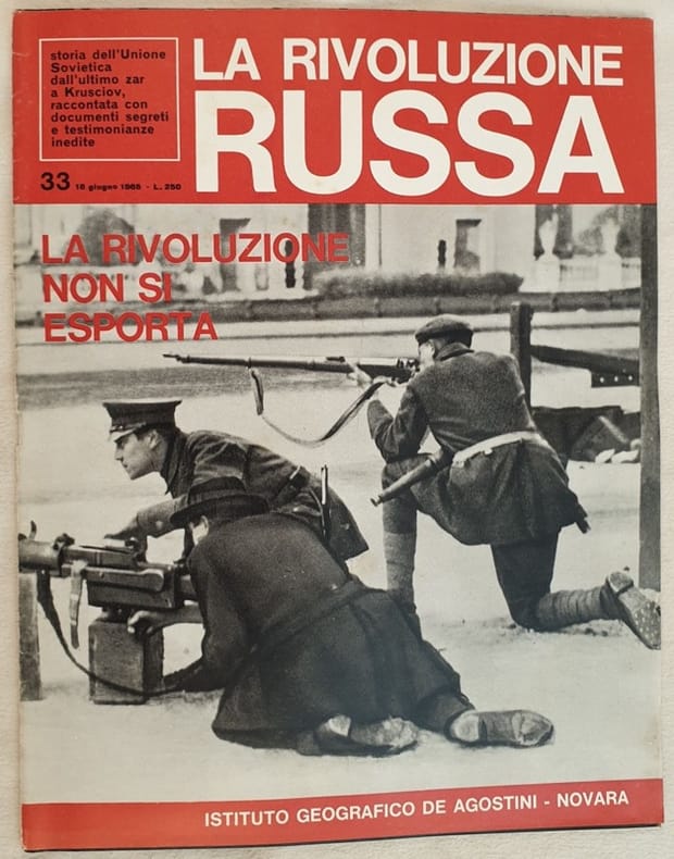 Numero del 18 giugno 1965 di questo fascicolo sulla Rivoluzione russa. In questo numero: Inaugurata la politica del fronte uniuco della classe operaia, L'internazionale comunista, Radek si sforza di far insorgere i lavoratori tedeschi, Trozki parla al Cremlino ai delegati del congresso, La disfatta di Bela Kun, Il congresso di Baku per la liberazione dei popoli coloniali, le maggiori speranze erano rivolte alla Repubblica tedesca, Dalla lega di Spartaco nasce il partito comunista tedesco ecc... Numerose fotografie d'epoca all'interno. In ottime condizioni. Copertina editoriale in ottime condizioni generali con lievi usure ai margini e dorso. Legatura in buone condizioni. All'interno le pagine si presentano in ottime condizioni con rare fioriture. In folio. Dim. 31x24,5 cm. Pp. da 385 a 416+(2). Number of 18th of june 1965 of this pamphlet about russian Revolution. In this number: policy of workers, internazionale comunista, Radek, Trozki talks to Kremlin to the Congress, Bela Kun, Congress Baku for liberation of colonial people, German republic, From the League of Spartaco nasce il partito comunista tedesco ecc... Different photoes inside. In very good conditions. Editorial cover in very good conditions slightly worn with the edges and spine. Binding in good conditions. Pages in very good conditions with occasional foxings. In folio. Dim. 31x24,5 cm. Pp. from 385 to 416+(2).