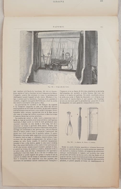 Interessante estratto del 1890 circa tratto dall'Enciclopedia delle arti e industrie edita da Utet sui tappeti scritto dall'Ing. Enrico Fontana. La parte relativa ai tappeti inizia da pag. 209 e consta di 4 pagine. All'interno qualche illustrazione che mostra diverse tecniche e strumenti. In ottime condizioni. Copertina assente. Legatura assente. All'interno le pagine si presentano in ottime condizioni con rare fioriture. In 4. Dim. 29x19,5 cm. Pp. da 209 a 212. Interesting extract of 1890 circa from Enciclopedia delle arti e industrie edited by Utet about carpets written by Enrico Fontana. The part relating carpets begins from pag. 209 and it is made uop of 4 pages. Inside different illustrations showing different techniques and instruments. In very good conditions. Cover is missing. Binding is missing. Inside pages are in very good conditions with occasional foxings. In 4. Dim. 29x19,5 cm. Pp. from 209 to 212.