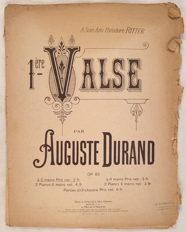 Edizione Ricordi del 1890 circa di questo spartito per pianoforte della melodia "!ere valse"" di Auguste Durand dall'opera 83. In mediocri condizioni con fioriture. Copertina editoriale in buone condizioni con usure marginali. Piatti quasi staccata. Legatura editorialmente assente. Completo di tutte le pagine. Formato in folio. cm. 35,5x27,5. Pp. 7. Ricordi edition of 1890 circa of this musical score for piano of the melody "!ere valse" by Auguste Durand from the work 83. Poor conditions, with foxings. Editorial cover in good conditions with worn edges. Plates are almost disbound. Binding is editoriarly loss. Complete of all pages. Formato in folio. cm. 35,5x27,5. Pp. 7.