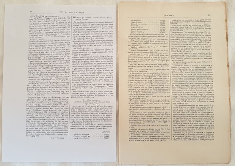 Interessante estratto del 1890 circa tratto dall'Enciclopedia delle arti e industrie edita da Utet sulla vernice scritto da Stanislao Fadda. La parte relativa alla vernice inizia da pag. 908 e consta di 13 pagine. All'interno numerose formule per la creazione delle vernici Prima pagina di testo mancante, viene fornita una fotocopia. In ottime condizioni. Copertina assente. Legatura in buone condizioni. All'interno le pagine si presentano in ottime condizioni con rare fioriture. Pagina 908 mancante. In 4. Dim. 30,5x21 cm. Pp. da 908 a 920. Interesting extract of 1890 from Enciclopedia delle arti e industrie edited by Utet about paints by Stanislao Fadda. The part relating paints begins from pag. 908 and is made up of 13 pages. Inside different formulas for the creation of paints. First page of text is missing, we provide a photocopy. In very good conditions. Cover is missing. Binding is almost missing. Inside pages are in very good conditions with occasional foxings. Page 908 is missing. In 4. Dim. 30,5x21 cm. Pp. from 908 to 920.