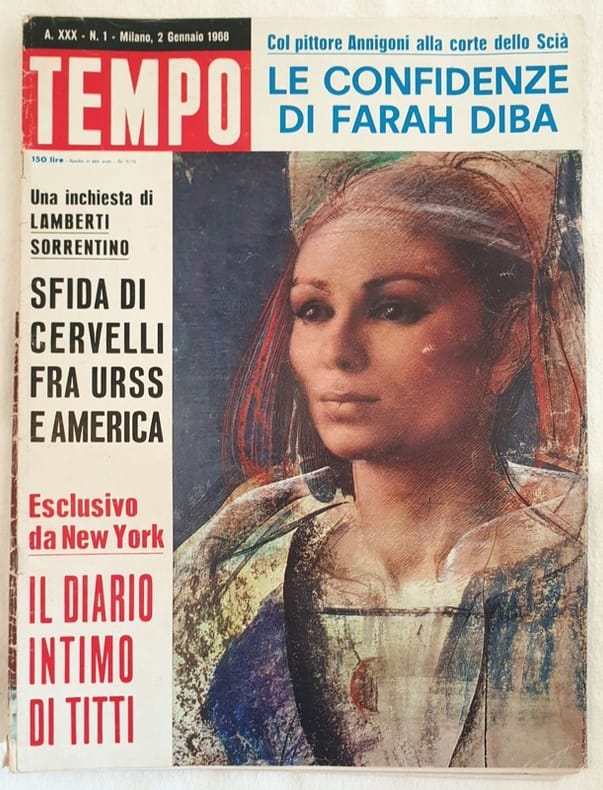 Numero del 2 gennaio 1968 della celebre rivista "Tempo" periodico fondato da Mondadori editore il 7 Giugno 1939 pubblicato fino al 1976. Ispirato alla rivista statunitense Life fu il primo rotocalco italiano a colori e il rivale di "Oggi". Tra gli articoli presenti: La Francia paghera i no di De Gaulle, La mingonna coloqui con Quasimodo, Maurizio Arena, Le confidenze dello scia e di Farah Diba alla corte di Teheran, Ninetta Treviso, Conti Agusta, storia di casa Savoia dal 1945, Lamberti Sorrentino, il film "Quattro stelle", Hemingway e Mussolini, Willy Rizzo, Hitler ha conquistato Londra senza saperlo, Renata Tibaldi, Al Festival di Sanremo vincerà Albano ecc.. Belle pubblicità a colori e in bianco e nero e colorati all'interno. In buone condizioni.Raro. Brossura editoriale in buone condizioni generali con lievi usure e strappi ai margini e dorso (vedere foto). Legatura in buone condizioni. All'interno le pagine si presentano in ottime condizioni con rare fioriture. In folio. Dim. 35x26,5 cm. Pp. 81.Number of the 2nd of january 1968 of the famous magazine "Tempo" magazine established by Mondadori editor the 7th of June 1939 published until 1976.Inspired to the american magazine Life was the first italian coloured rotocalco and the rival of "Oggi". Between the issues treated: De Gaulle, Speeches of Quasimodo, Maurizio Arena, Confidences of Farah Diba in the court of Teheran, Ninetta Treviso, Conti Agusta, History of Savoy House from 1945, Lamberti Sorrentino, The Movie "Quattro stelle", Hemingway e Mussolini, Willy Rizzo, Hitler ha conquistato Londra senza saperlo, Renata Tibaldi, Al Festival di Sanremo vincerà Albano etc.. In good conditions.Scarce copy. Editorial cover in very good general conditions slightly worn with tears in the edges and spine. Inside pages are in good conditions with occasional foxings. In folio. Dim. 35x26,5 cm. Pp. 81.