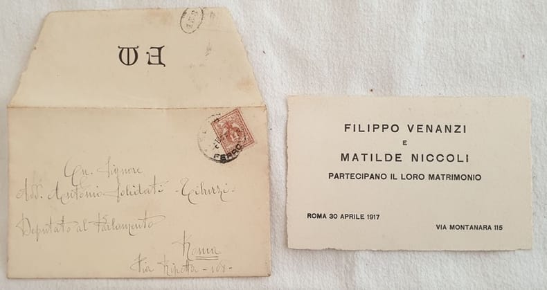 Partecipazione di nozze tra Filippo Venanzi e Matilde Niccoli, via Montanara 115 da celebrarsi il 30 aprile 1917. Busta affrancata viaggiata. In ottime condizioni. Formato cm 9x14. Beautiful wedding card of Filippo Venanzi and Matilde Niccoli, via Montanara 115 to be celebrated the 30th of april 1917. In very good conditions. Size cm 9x14.