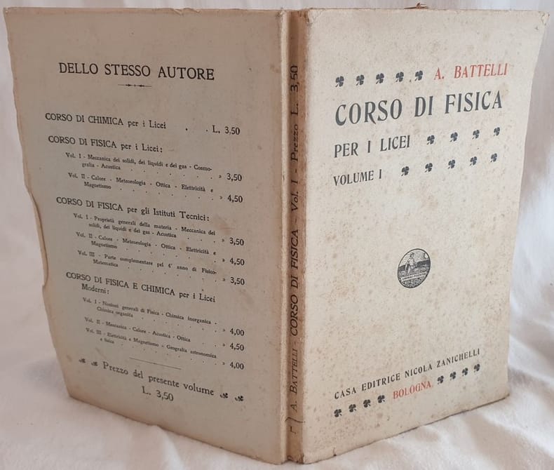 Edizione del 1914 di questa opera di fisica di Angelo Battelli (1862-1916) fisico politico e accademico italiano. Battelli vinse il concorso per la cattedra di fisica sperimentale insegnando prima a Cagliari, poi a Padova e infine a Pisa dal 1893. Tra gli argomenti trattati: cinematica, statica, macchine semplici, dinamica, lavoro ed energia, idrostatica, statica dei gas, azioni molecolari nei fluidi, cosmografia, acustica ecc... Numerose illustrazioni all'interno. In buone condizioni. Copertina editoriale in buone condizioni generali con lievi usure ai margini e dorso. Legatura in buone condizioni. All'interno le pagine si presentano in ottime condizioni con rare fioriture, ancora da rifilare. In 8. Dim. 22,5x14,5 cm. Pp. 264. Edition of 1914 of this work of physics by Angelo Battelli (1862-1916) italian physics politican and academical. Battelli won the concourse for cattedra of experimental physics tecaching in Cagliari, Padoa and Pisa from 1893. Inside mechanics, cosmography, acustics ecc... Different illustrations inside. In good conditions. Editorial cover in good general conditions slightly worn in the edges and spine. Binding in good conditions. Pages in very good condiitons with occasional foxings, still uncut. In 8. Dim. 22,5x14,5 cm. Pp. 264.