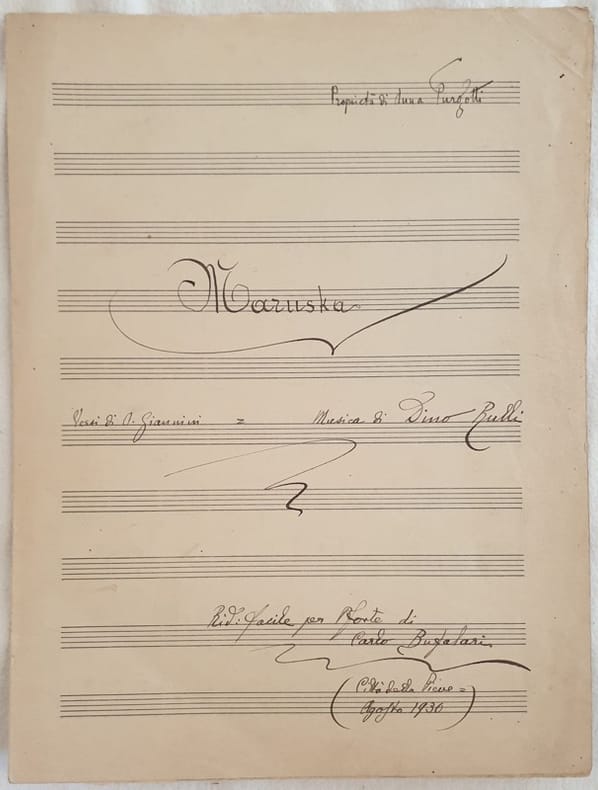 Spartito manoscritto del 1930 per pianoforte della melodia "Maruska" di Dino Rulli Versi di A. Giannini. Riveduto da Carlo Bufalari. Nota manopscritta Citta della Pieve Agosto 1930. In ottime condizioni con lievi usure. Copertina assente. Legatura quasi assente. All'interno le pagine si presentano in buone condizioni con fioriture. In 4. Dim. 28,5x22 cm. Pp. (4). Handwritten musical score of 1930 of the melody for piano "Maruska" by Dino Rulli. words by A. Giannini. Reviewed by Carlo Bufalari. Handwritten note Citta della Pieve August 1930. In very goodconditions with occasional foxings. Cover is missing. Binding is almost missing. Pages in good conditions with foxings. In 4. Dim. 28,5x22 cm. Pp. (4).