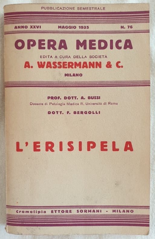 Edizione del 1935 di questa pubblicazione sull'erispela di A. Bussi e F. Bergolli della collana Wassermann. In ottime condizioni. Copertina editoriale in ottime condizioni generali con lievi usure ai margini e dorso. Legatura in buone condizioni. All'interno le pagine si presentano in ottime condizioni. In 16. Dim. 18x11,5 cm. Pp. 288. Edition of 1935 of this pamphlet of Egypt by A. Bussi e F. Bergolli of the series Wassermann. In very good conditions. Editorial cover in very good conditions slightly worn in the edges and spine. Binding in good conditions. Inside pages are in very good conditions. In 16. Dim. 18x11,5 cm. Pp. 288.