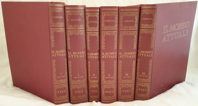Edizione del 1960 di questa opera geografica dello storico della geografia e cartografia esploratore e naturalista Roberto Almagia (1884-1962). L'opera è composta da sei tomi divisi in tre volumi ed è completa. Numerose mappe qualcuna colorata, illustrazioni e foto d'epoca nel testo. All'interno: La conoscenza della terra, Oceani, Continente Antico, Europa Occidentale, Europa Meridionale, Centrale, Settentrionale, Unione Sovietica, Asia Anteriore, Asia Meridionale e Asia Sudorientale, Asia Orientale e Asia Centrale, Africa settentrionale, Sahara e Sudan, Africa Centrale, Australe, Orientale, Sgurado generale al Continente nuovo, Canada e Alaska, Stati Uniti, Messico America Centrale e Antille, America Meridionale Temperata, Australia e Oceania, Terre Polari ecc... In ottime condizioni. Copertina in tela editoriale in ottime condizioni con lievi usure ai margini e dorso. Legatura in buone condizioni. Pagine in ottime condizioni con rare fioriture. In 8. Cm 26,5x20. Pp. XV+1411, VIII+1257, XI+1386. Peso Kg. 13,00. Edition of 1960 of this geographical work by the hystorian of geography and cartographer, explorer and naturalist Roberto Almagia (1884-1962). The work is made up of six tomes bound together in three volumes and it is complete. Different maps some are coloured, illustrations and photoes of that time inside. Inside: Knowledge of Earth, Oceani, Continente Antico, Europa Occidentale, Europa Meridionale, Centrale, Settentrionale, Unione Sovietica, Asia Anteriore, Asia Meridionale e Asia Sudorientale, Asia Orientale e Asia Centrale, Africa settentrionale, Sahara e Sudan, Africa Centrale, Australe, Orientale, Sgurado generale al Continente nuovo, Canada e Alaska, Stati Uniti, Messico America Centrale e Antille, America Meridionale Temperata, Australia e Oceania, Terre Polari ecc... In very good conditions. Editorial cloth cover in very good condtions slightly worn in the edges and spine. Binding in good conditions. Pages in very good conditions with occasional foxings. In 8. Cm 26,5x20. Pp. XV+1411, VIII+1257, XI+1386. Weight Kg. 13,00.