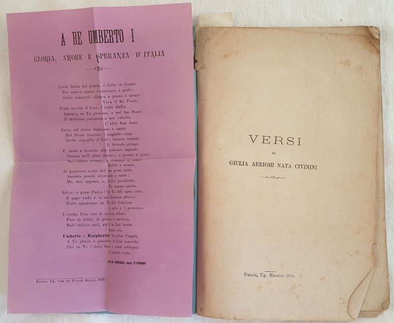 Prima edizione del 1874 di questa opera poetica scritto della scrittrice educatrice Giulia Arrighi nata Civinini (1838-1907) nata a Pisa. Dedica a Giulia Gelli nata Sozzifanti. Ultima pagina 127 mancante. Insieme al volume la poesia "A Re Umberto I gloria amore e speranza d'Italia" pubblicata in foglio singolo (Pistoia, Tip. Cino dei Fratelli Bracali 1878). In buone condizioni. Copertina editoriale in buone condizioni generali con lievi usure ai margini e dorso. Piatto posteriore assente. Legatura in discrete condizioni con rotture. Pagine in ottime condizioni con rare fioriture. Ultima pagina 127 mancante. In 8. Dim. 21x14 cm. Pp. 126. Original edition of 1874 of this poetical work written by the writer educator Giulia Arrighi born Civinini (1838-1907) born in Pisa. Dedication to Giulia Gelli born Sozzifanti. Last page 127 is loss. Together with the volume the poem "A Re Umberto I gloria amore e speranza d'Italia" published in a single leaf (Pistoia, Tip. Cino dei Fratelli Bracali 1878). In good conditions. Editorial cover in good general conditions slightly worn in the edges and spine Back plate is loss. Binding in fair conditions with cracks. Inside pages are in very good conditions with occasional foxings. Last page 127 is loss. In 8. Dim. 21x14 cm. Pp. 126.