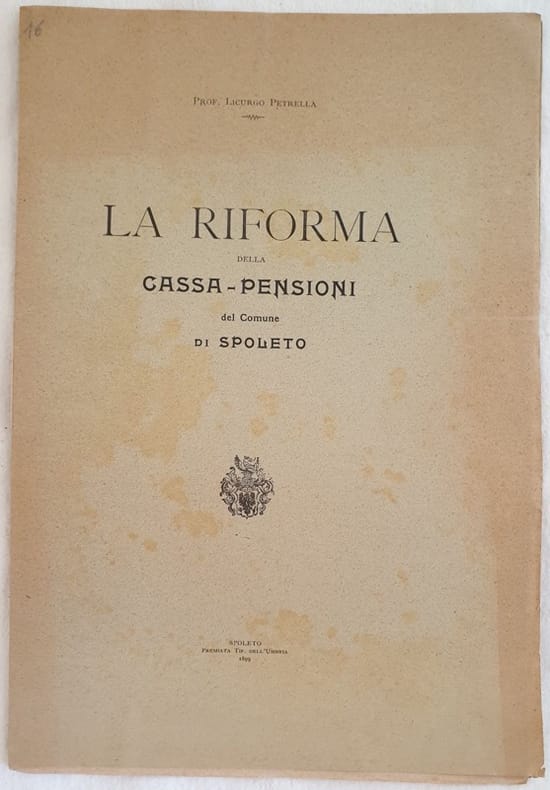Interessante pubblicazione del 1899 sulla riforma della cassa pensioni del comune di Spoleto scritto dal Prof. Licurgo Petrella. In buone condizioni. Copertina editoriale in ottime condizioni generali con lievi usure ai margini e dorso. Legatura in buone condizioni. All'interno le pagine si presentano in ottime condizioni con rare fioriture. In 4. Dim. 28,5x20 cm. Pp. 16. Interesting pamphlet of 1899 about reformation of retirement fund of comune of Spoleto written by Prof. Licurgo Petrella. In good conditions. Editorial cover in very good general conditions slightly worn in the edges and spine Binding in good conditions. Inside pages are in good conditions with foxings. In 4. Dim. 28,5x20 cm. Pp. 16.<BR><BR>