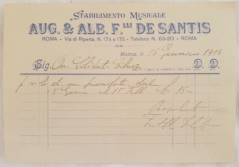 Fattura del 15 gennaio 1914 dello Stabilimento musicale Aug. & Alb. F.lli de Santis di Roma per il nolo di un pianoforte In buone condizioni, piegature. Dim. cm 14,5x21Invoice of the 15th of january 1914 of Stabilimento musicale Aug. & Alb. F.lli de Santis of Rome for the rental of a piano. In good conditions, foldings. Dim. cm 14,5x21
